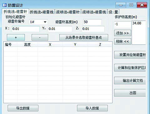 可使用折線法和滾球法完成避雷針及避雷線的聯(lián)合保護(hù)計(jì)算,可生成防雷保護(hù)范圍圖和計(jì)算書(shū),可在三維的界面上方便地查看設(shè)計(jì)成果。
