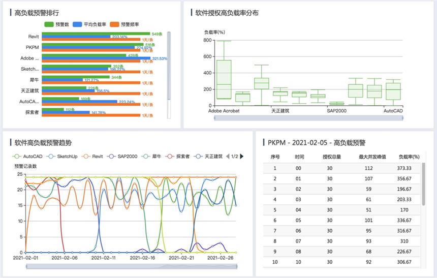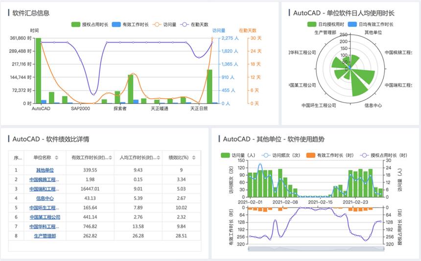 多少套軟件?安裝在多少臺(tái)設(shè)備?活躍度如何?并發(fā)高峰何時(shí)出現(xiàn)?一張圖看得清清楚楚。