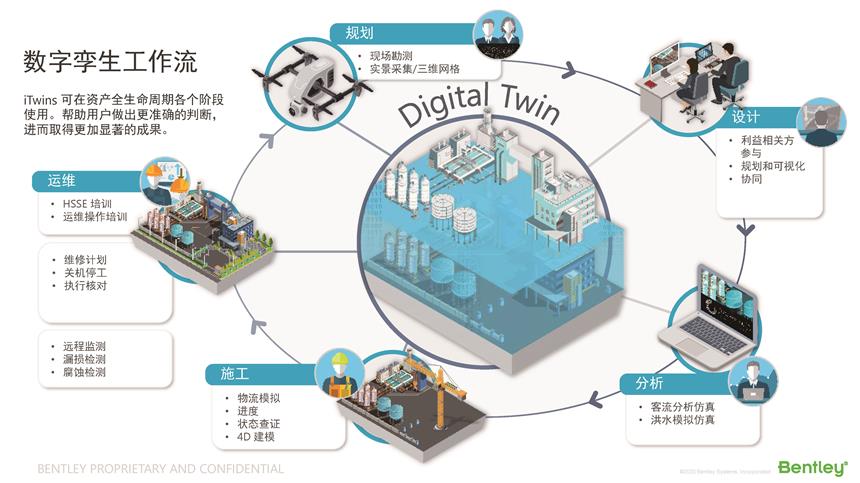 Bentley數字孿生(DigitalTwin)平臺是專為基礎設施項目中數字化工作流打造的新一代數字孿生云平臺。平臺支持基礎設施資產全生命周期可視化、跟蹤變更并執行分析,從而優化資產性能。該平臺可將工程數據、實景數據和物聯網數據相結合,獲得基礎設施地上和地下的整體視圖。沉浸式可視化和分析可見性可幫助管理者和決策者更深入地了解基礎設施資產,并可通過看板、報表更好的識別集成信息,做更精準的決策。